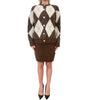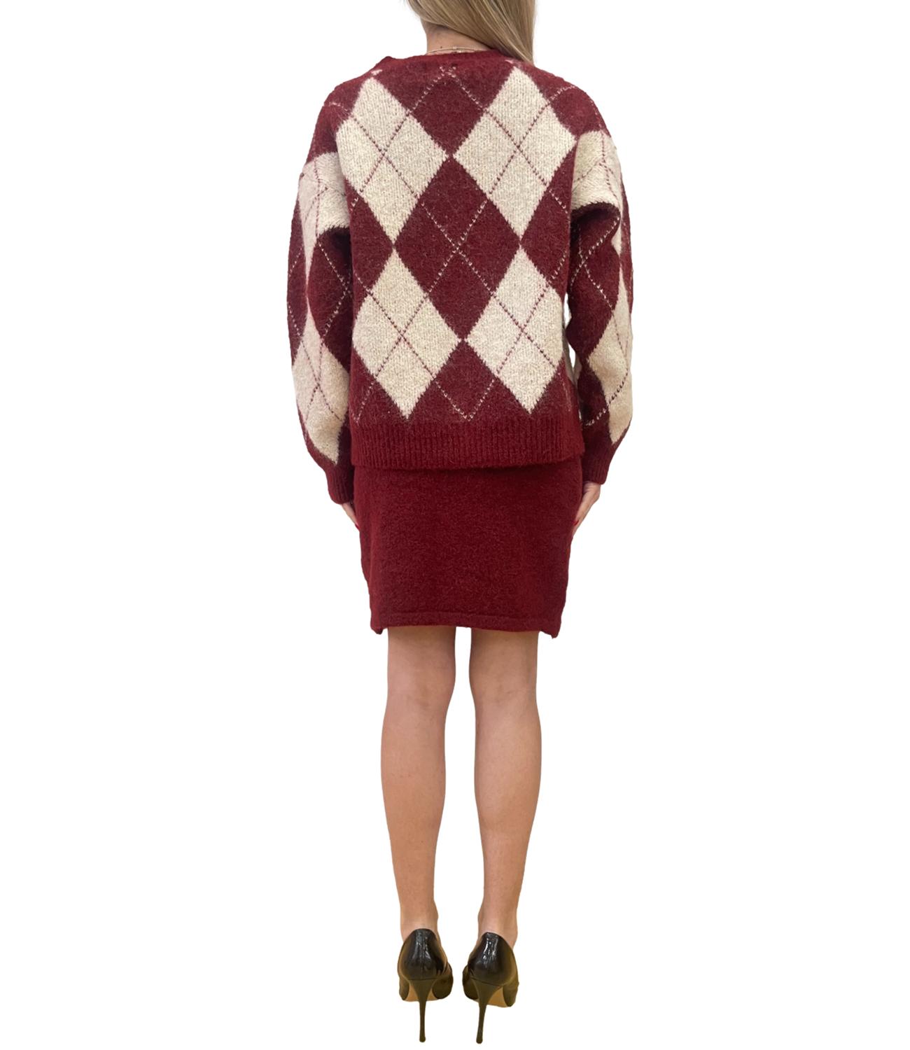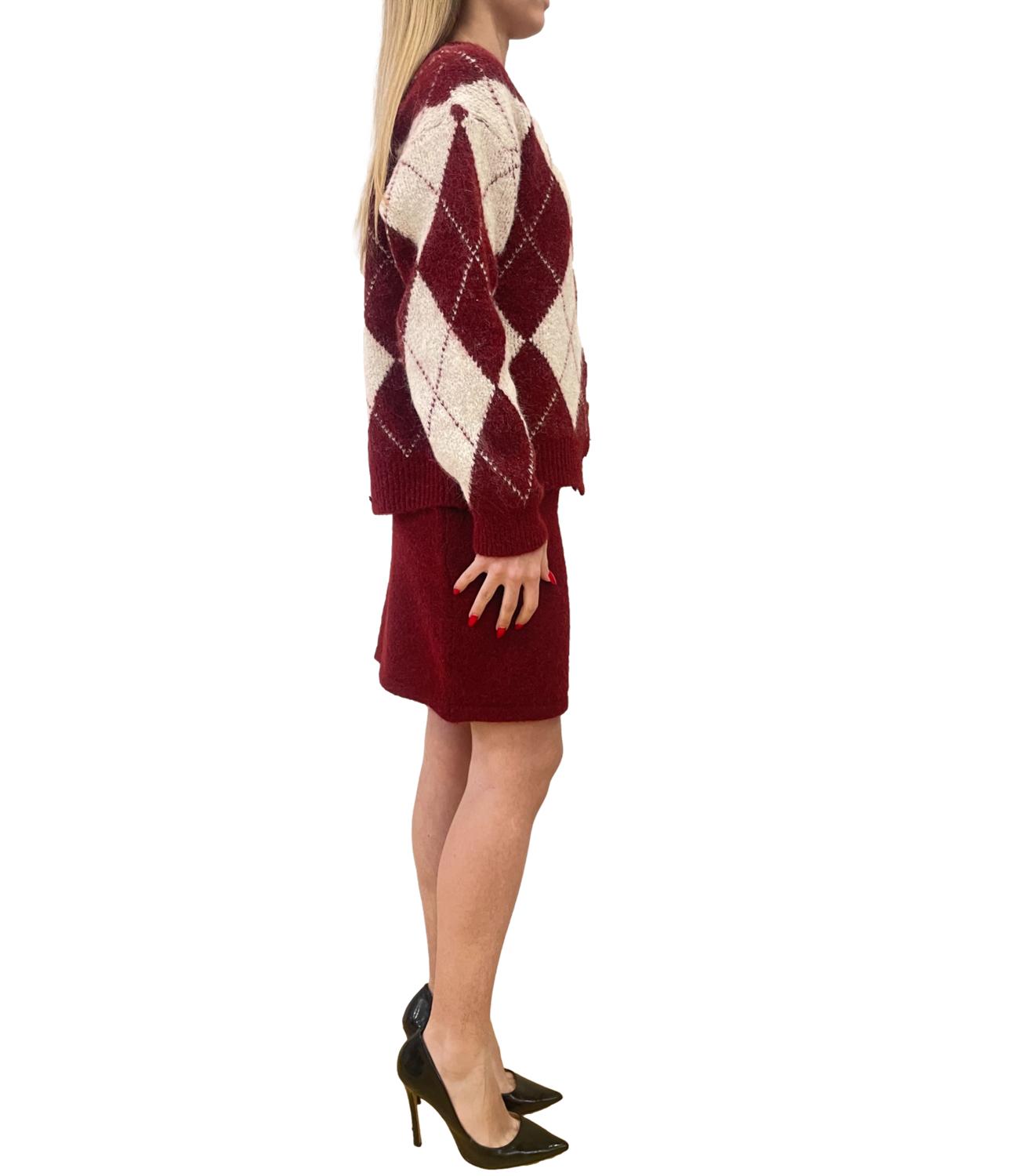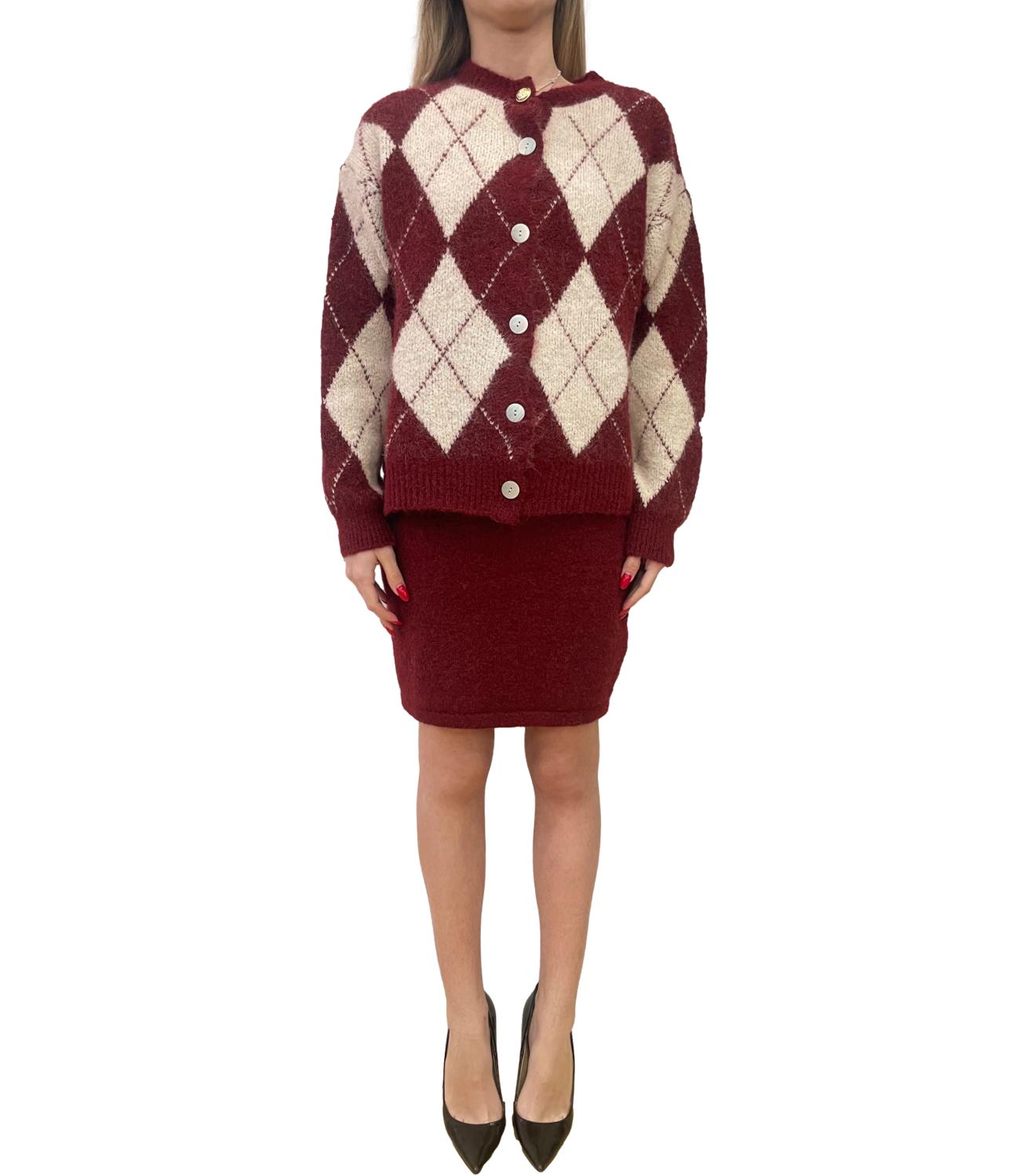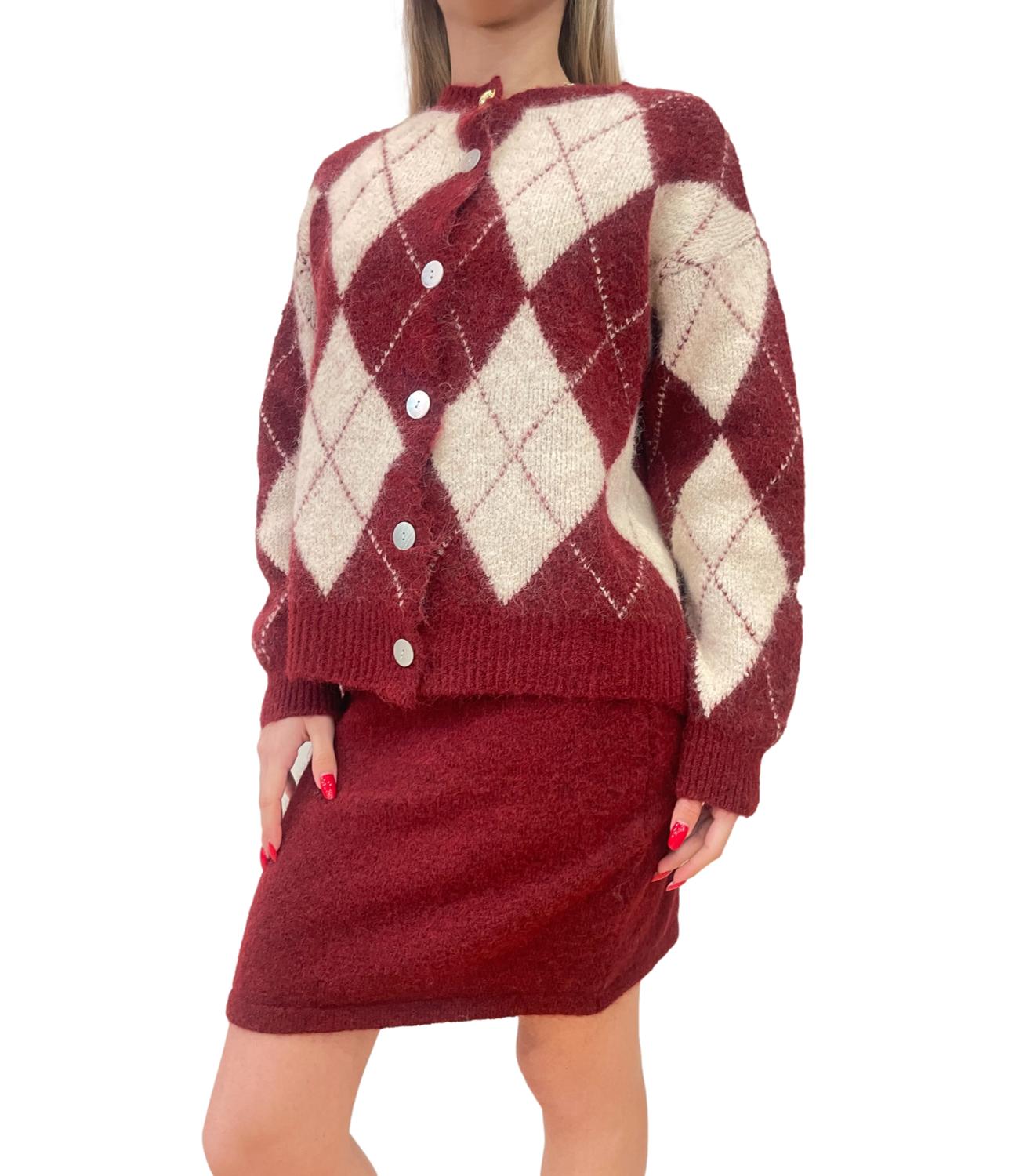 Completo composto da gonna e cardigan coordinato con motivo rombi. Dettaglio bottone gioiello sul collo.