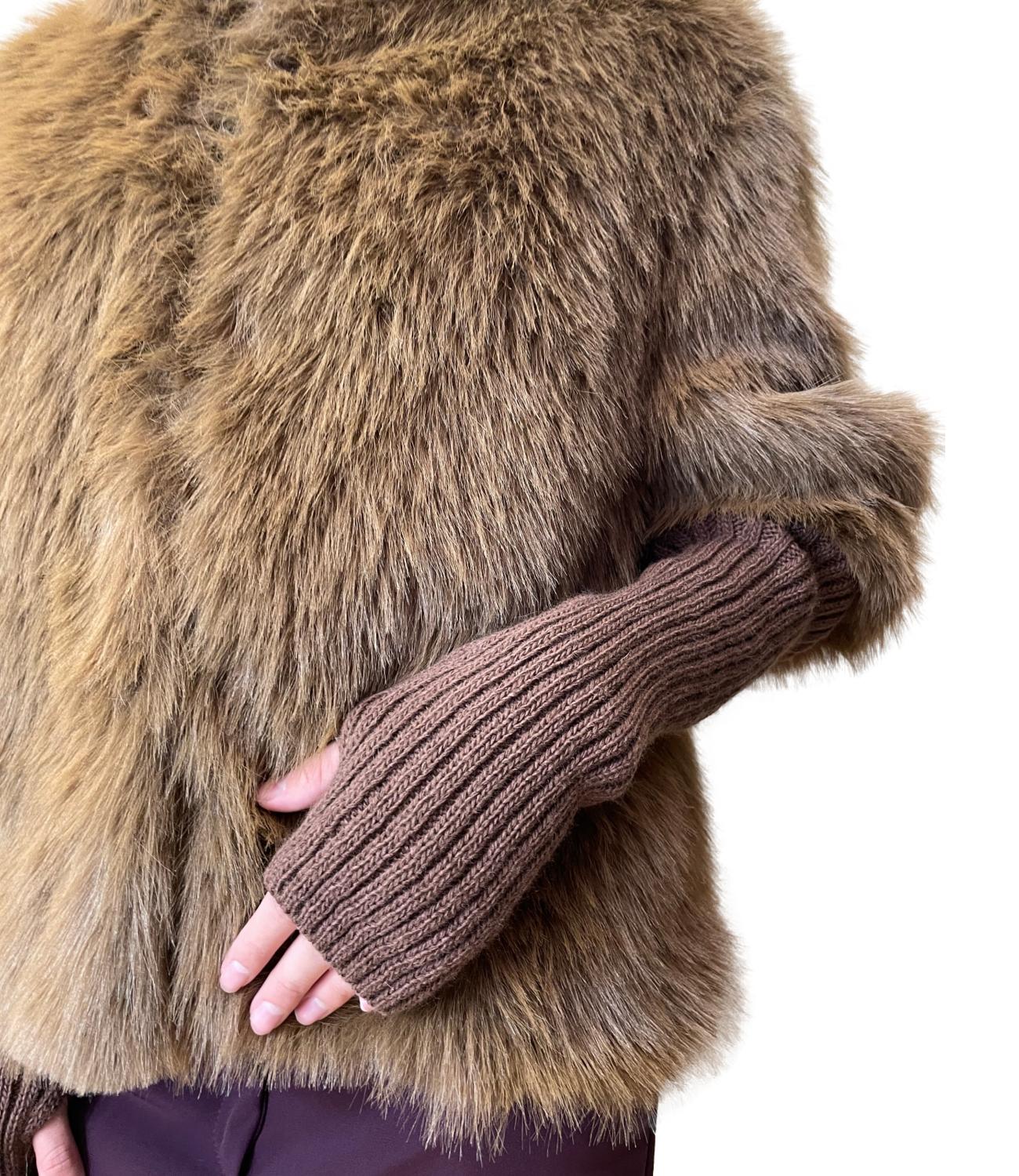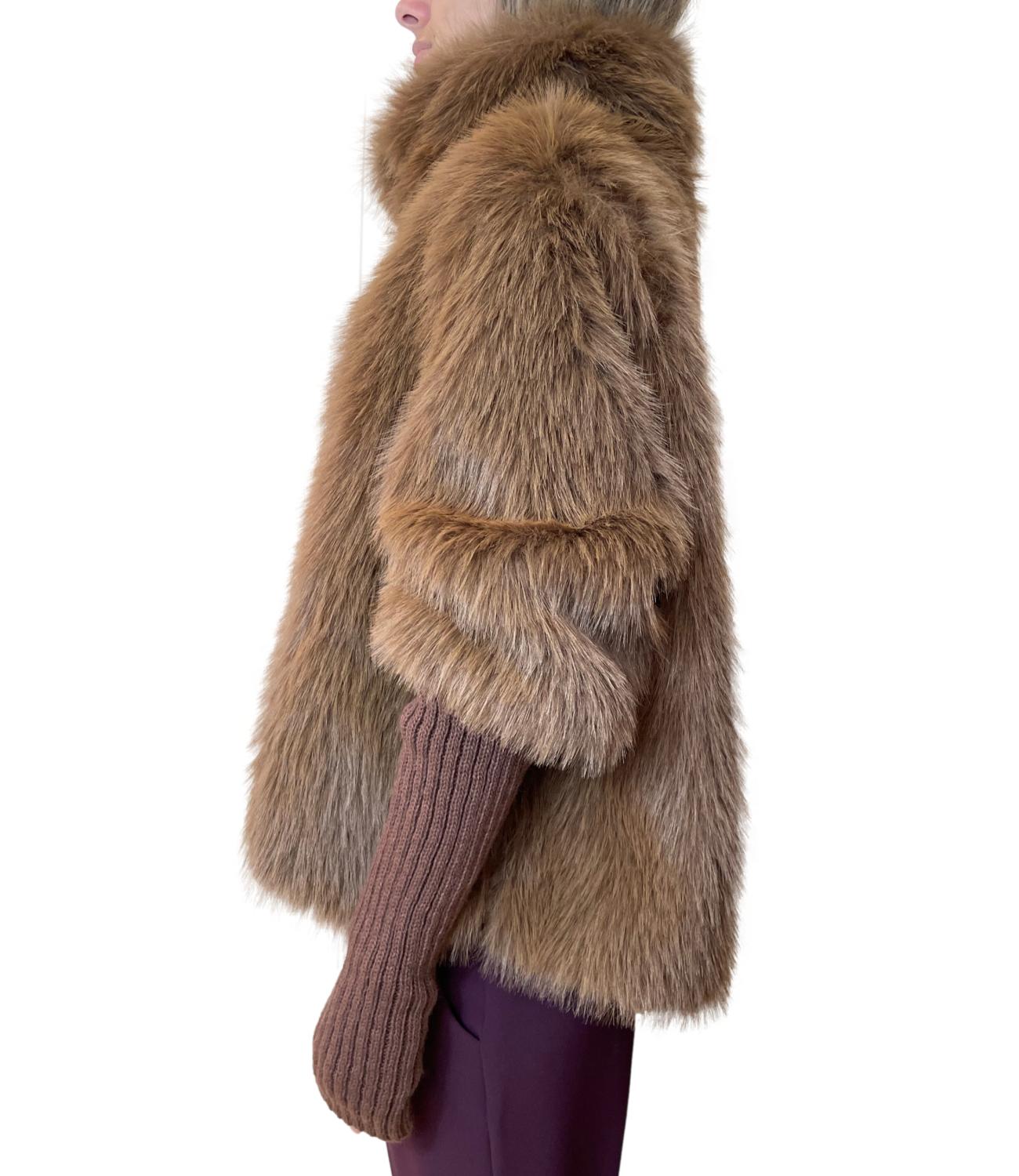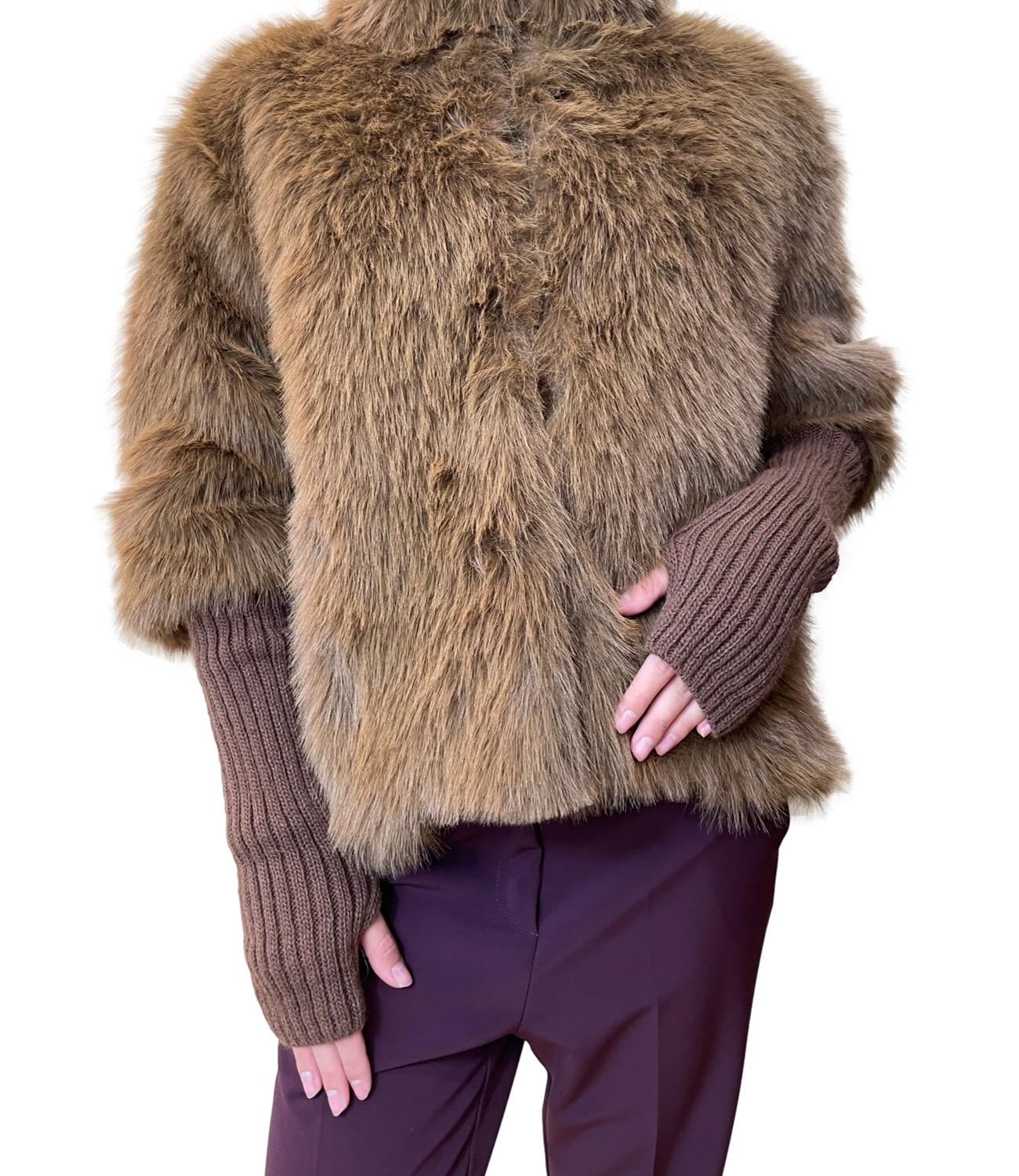 Pellicciotto con collo in ecofur, fodera in raso, maniche a tre quarti con manicotto in lana incorporato.