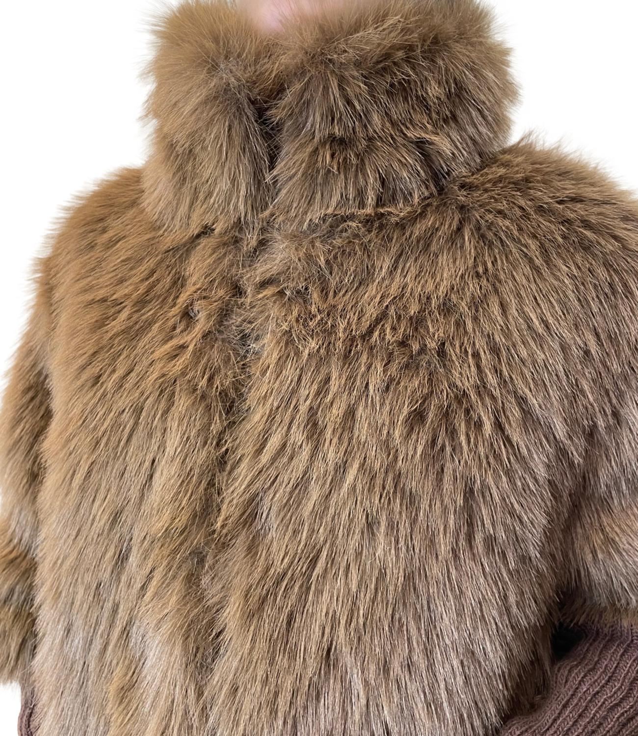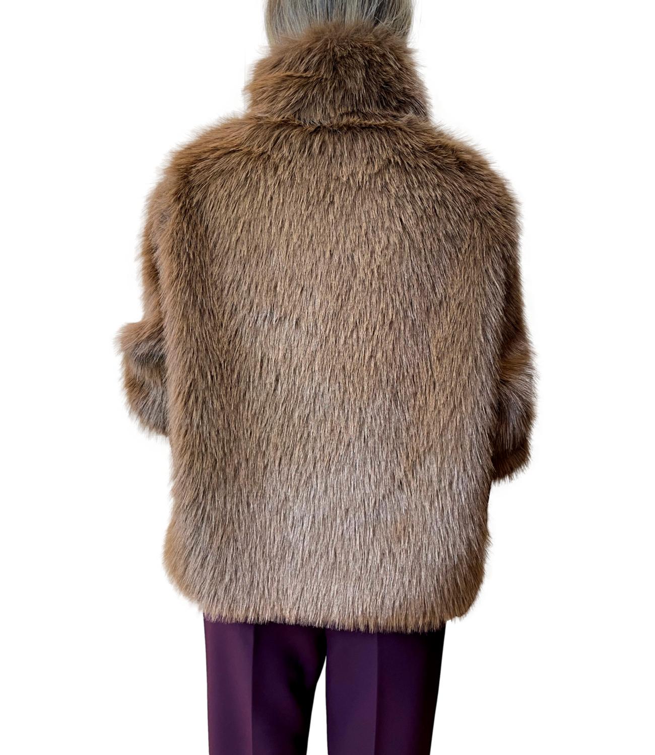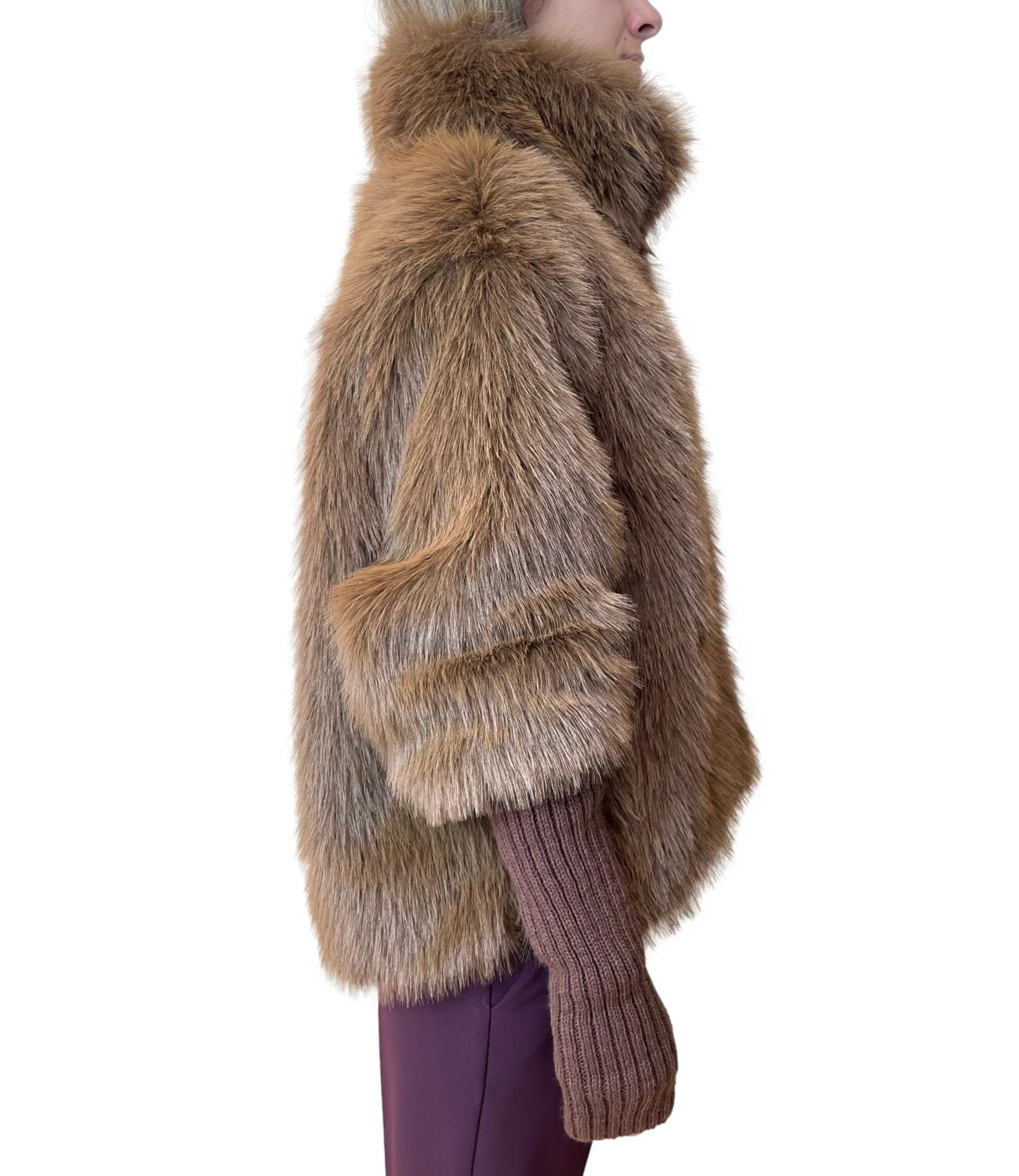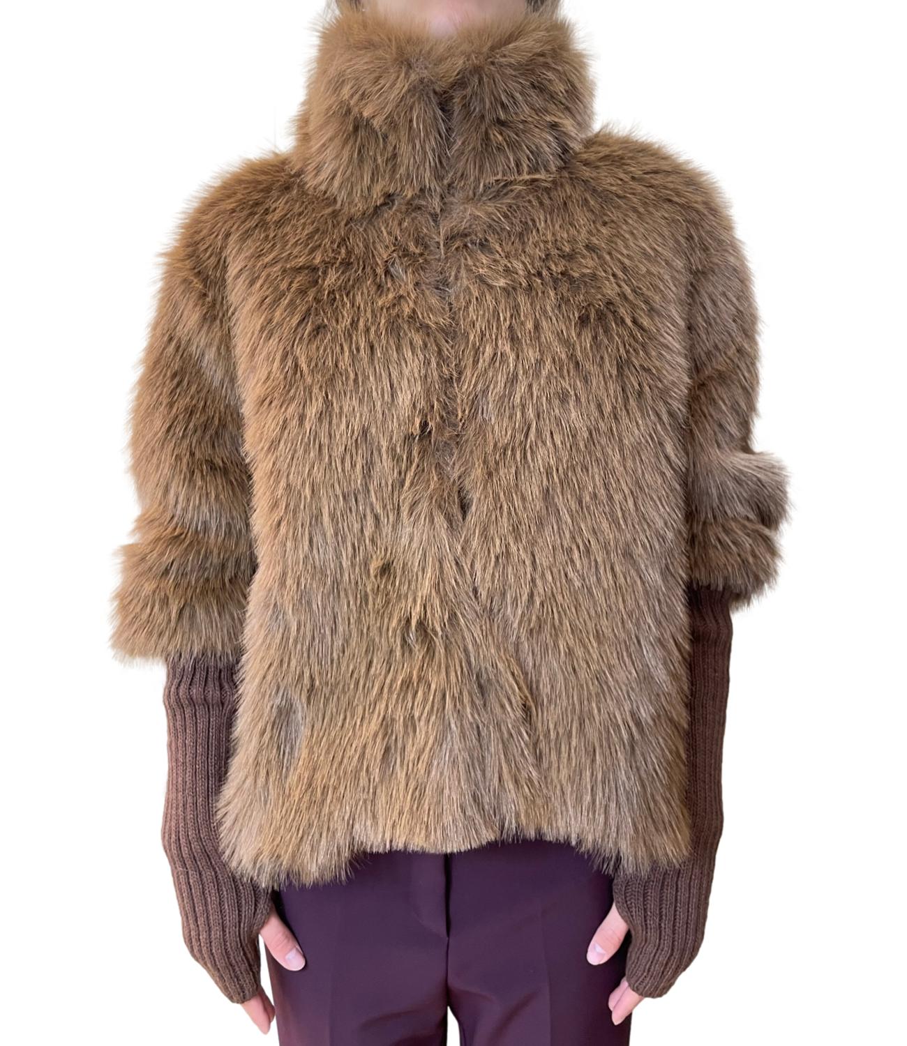 Pellicciotto con collo in ecofur, fodera in raso, maniche a tre quarti con manicotto in lana incorporato.