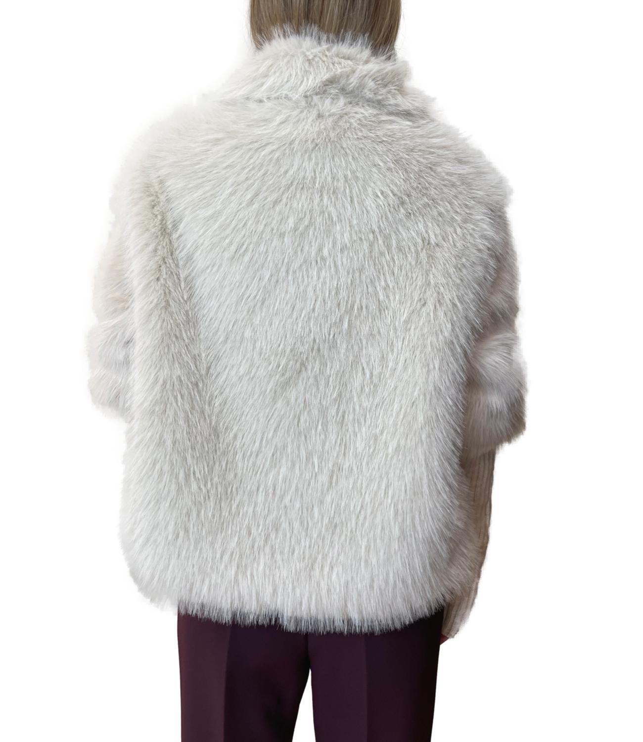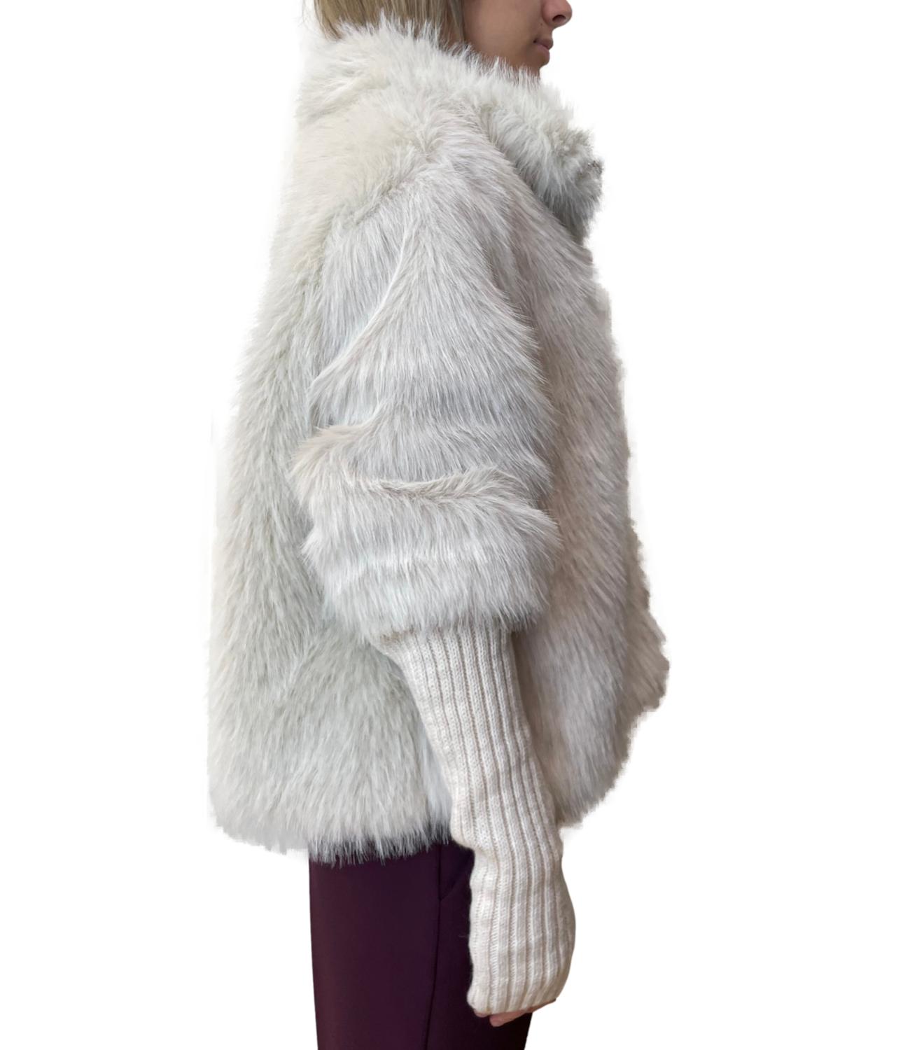 Pellicciotto con collo in ecofur, fodera in raso, maniche a tre quarti con manicotto in lana incorporato.