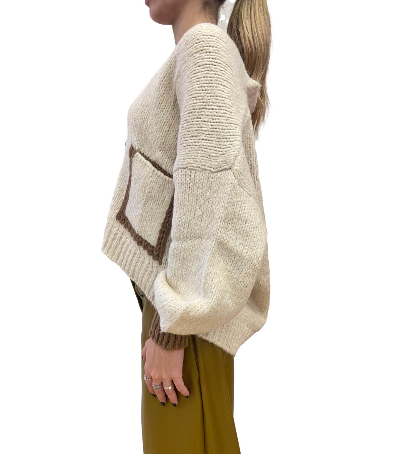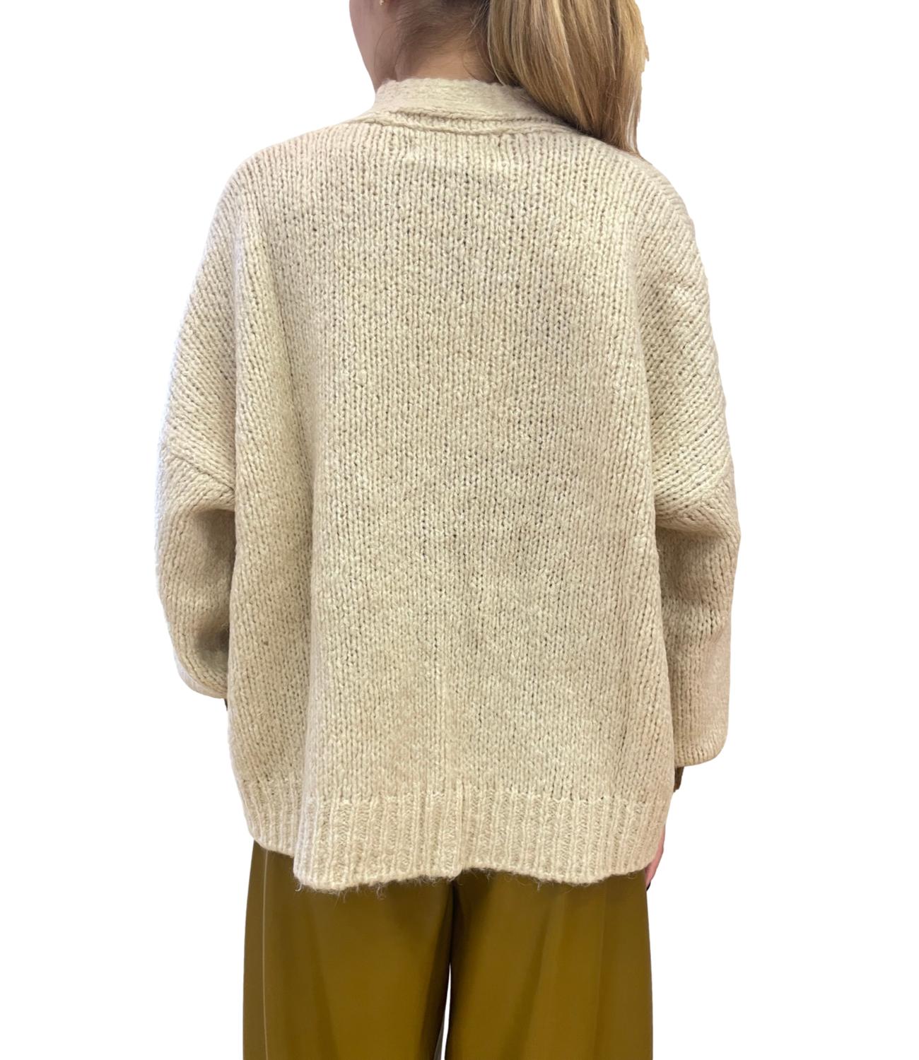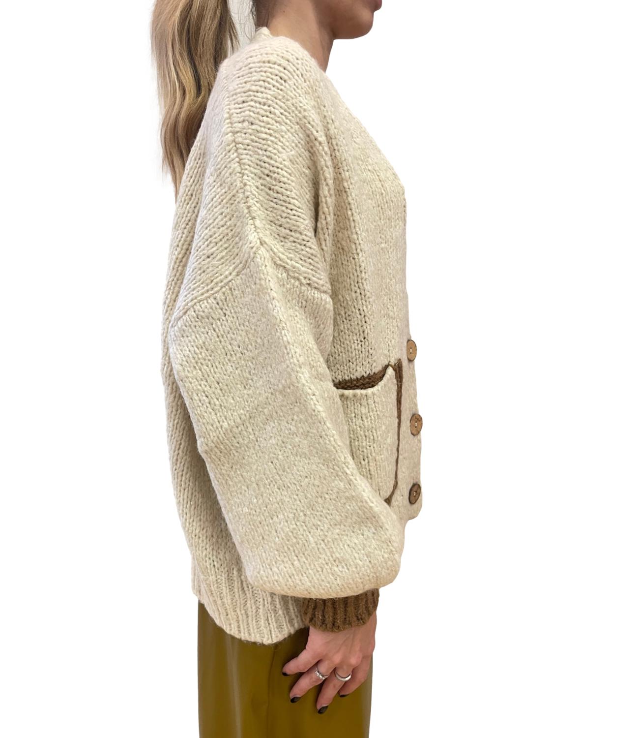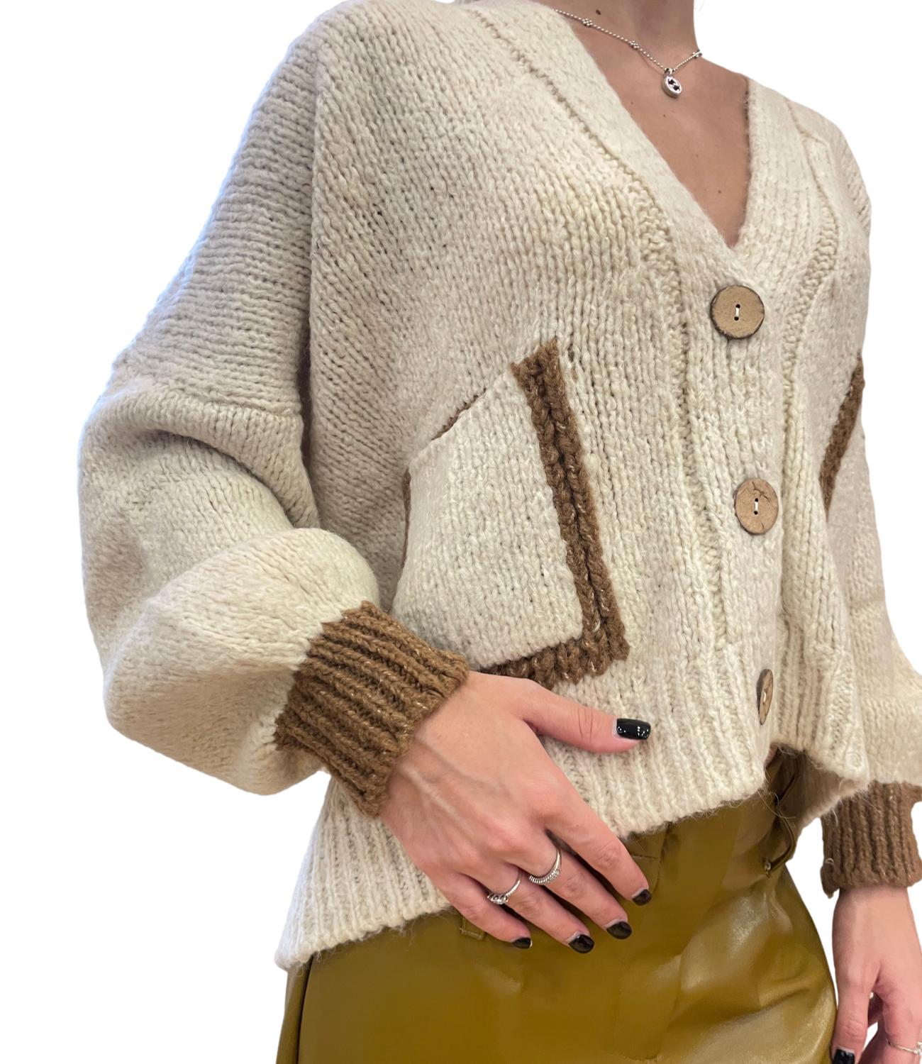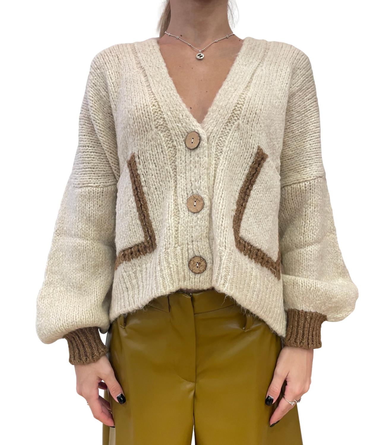 Cardigan 3 bottoni modello sciallato con tasche sul davanti e profili a contrasto