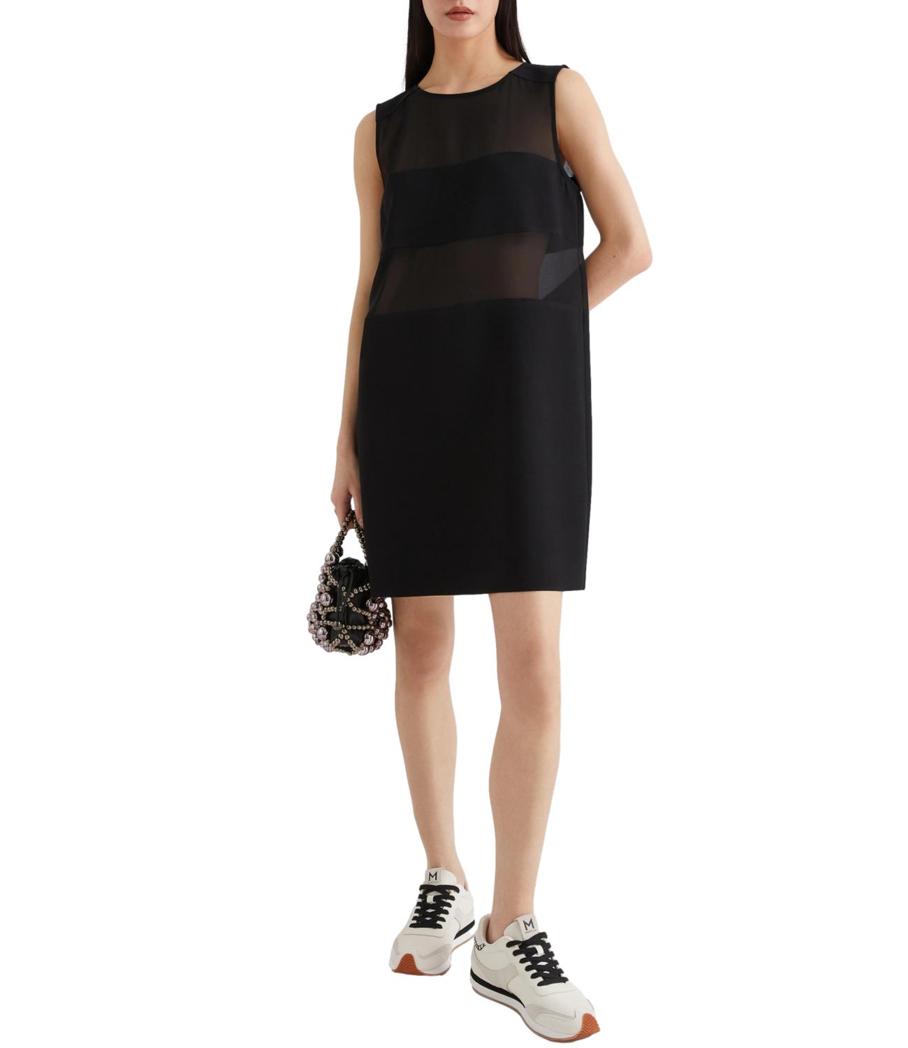 Essenziale nelle linee, sofisticato nei materiali: nuovo abito smanicato in envers satin, con pannelli orizzontali in georgette che creano un gioco sensuale di trasparenze sul busto.