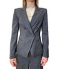 Giacca doppiopetto dal taglio sartoriale con motivo gessato, bavero a lancia e taschine a filo. Rifinita con impuntura a margine e taglio smoking, unisce eleganza classica e stile contemporaneo.