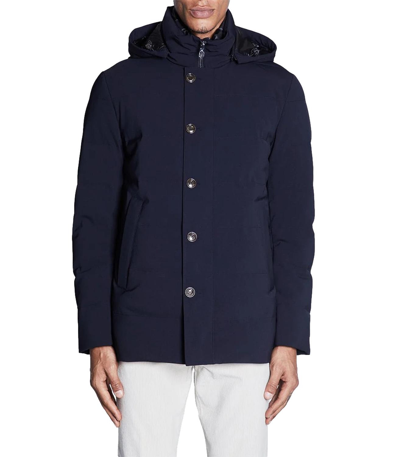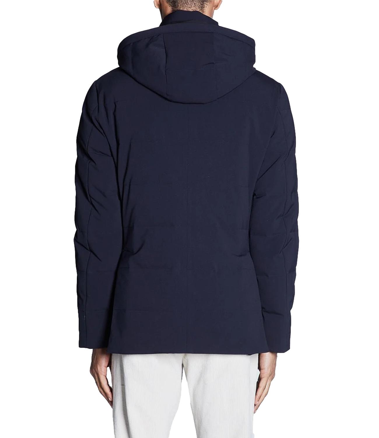 Giaccone midi imbottito firmato Montecore realizzato in tessuto tecnico blu e caratterizzato da collo alto, cappuccio rimovibile con coulisse, chiusura con zip e bottoni, tasche laterali a filo e orlo curvo. Fodera interna in nylon trapuntato. Imbottitura in piuma leggera.